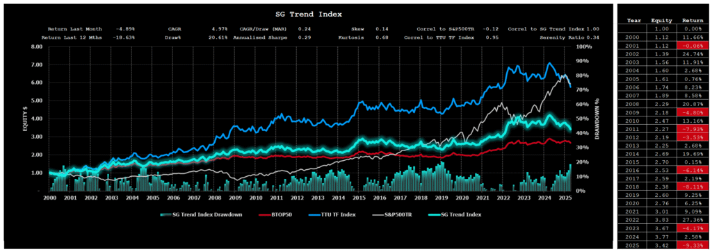 The performance of the SG Trend Index since 1st January 2000 to the end of last month is seen in Chart 2 below: