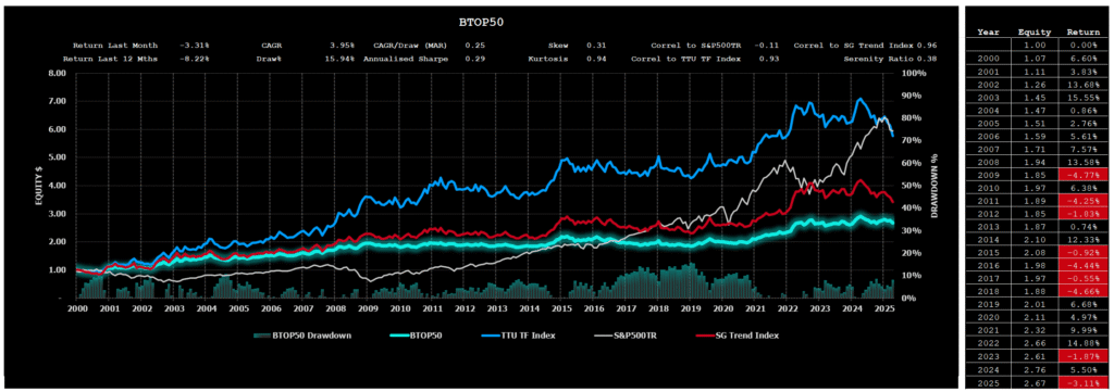 The performance of the BTOP 50 Index since 1st January 2000 to to the end of last month is seen in Chart 4 below: