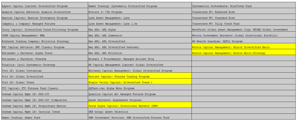 There was a slight modification to the Index from January 2013 to the present. Previously the Programs needed to be a constituent of the SG CTA Index and the 10 largest Managers was not a requirement.