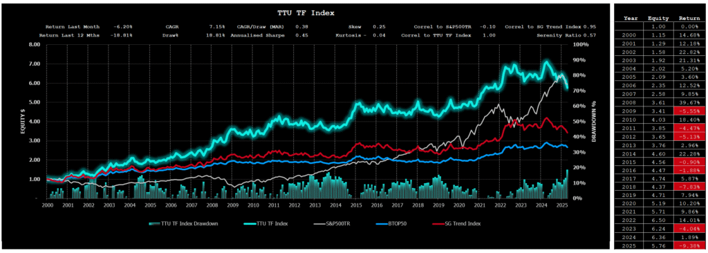 The performance of the TTU TF Index since 1st January 2000 to to to the end of last month is as follows: