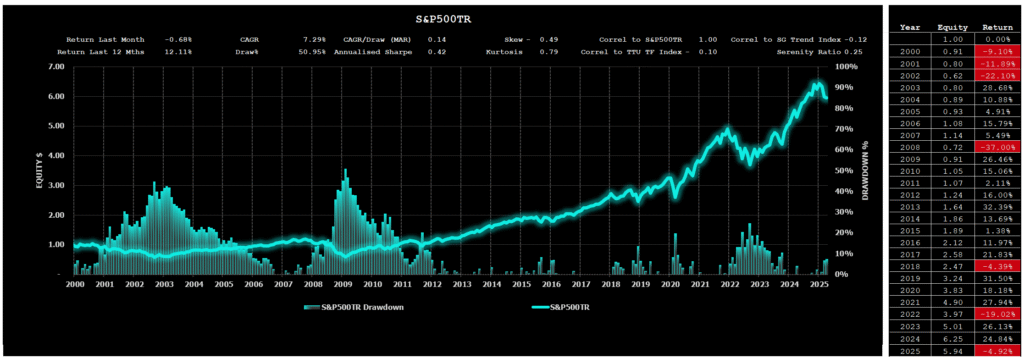 From January 1, 2000, to April 30, 2025, the TTU Trend Following Index achieved a Compound Annual Growth Rate (CAGR) of 7.15% and experienced a Maximum Drawdown of 18.81% (see Chart 6 above). In comparison, the S&P 500 Total Return Index, which includes dividends, posted a CAGR of 7.29% but faced a much higher and steeper Maximum Drawdown of 50.95% over the same period (refer to the chart below).