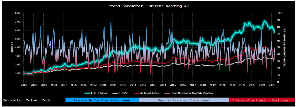 The TTU Trend Barometer closed April 2025 at 48 signalling neutral conditions for trend followers. However, it’s important to recognize that the Barometer reflects conditions at month-end, which may not fully capture the dynamics of intra-month performance. Additionally, its readings can be influenced by short-term models, which may diverge from the medium- to long-term trend-following strategies favoured by the broader trend-following community.