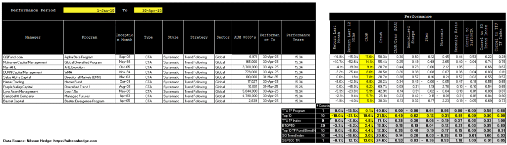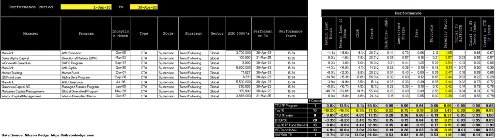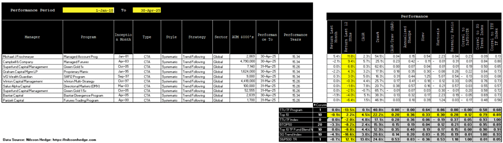 As of April 30, 2025, the TTU Trend Following Index draws from a universe of 49 active programs. The Index’s monthly return is calculated using the average performance of all programs that have submitted their reports for the month. As of the reporting date, 44 out of 49 programs had reported their April results. The table below highlights those programs still pending.