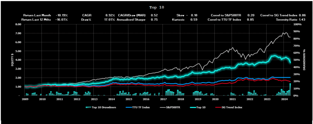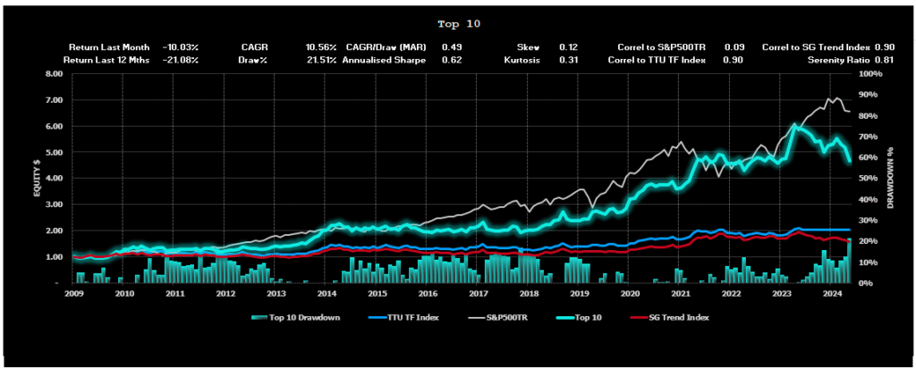 Of course, we already know this ‘diversification’ principle of Trend Following. As we increase our diversification efforts, we obtain improvement both in terms of the maximum drawdown and in the CAGR generated by the ensemble. This is why we seek to strive for maximum market and system diversification within our individual programs. The TTU TF Index just takes this diversification one step further and diversifies across many different TF Programs to deliver a superior risk-adjusted result.