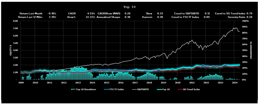 The SG Trend Index is designed to track the 10 largest trend following CTA’s of the managed futures space.