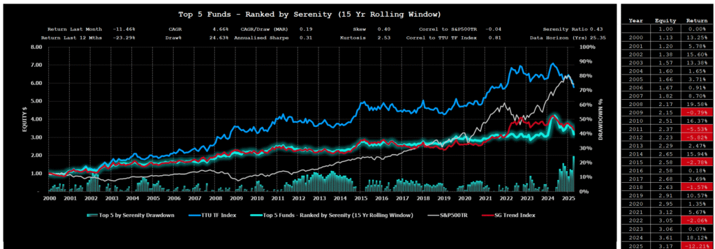 As part of the reconstitution in early 2025, Mulvaney Capital’s Global Diversified Program was included in the Serenity Index due to its qualifying long-term track record and high Serenity Ratio. However, it’s important to note that this inclusion has introduced significantly higher volatility to the composite, given the program’s inherently more aggressive profile.