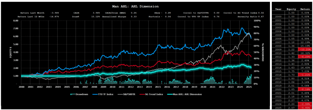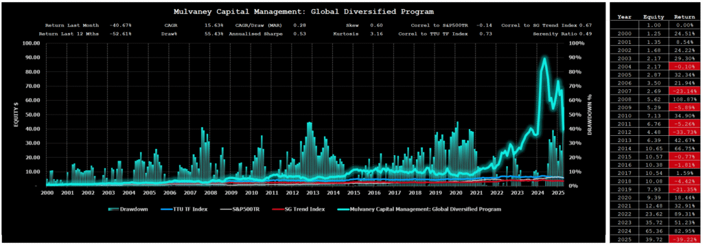 Unlike prior market regimes where at least one sector — commodities, rates, or FX — offered sustained trend opportunities, April served up synchronized disorder. Metals rallied, then reversed. Energies surged on geopolitical flareups, only to collapse on macro headlines. Bonds and equities swung chaotically, offering little consistency. Even diversification — often trend’s last refuge — provided little protection as uncorrelated behaviour turned briefly correlated at the worst moments.