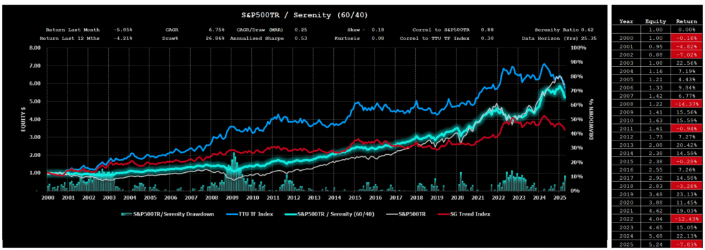 The comparison of alternative portfolio allocations above highlights the strong historic risk adjusted returns that have been enjoyed by 60% S&P500TR / 40% Serenity Composite Portfolio.