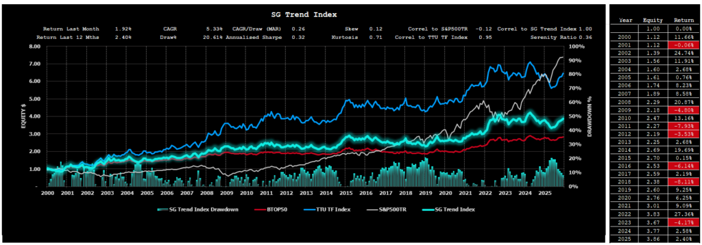 Since its launch in 2000, the SG Trend Index has maintained its role as a core institutional benchmark for trend-following performance. It consistently sits between the higher-returning TTU Trend Following Index and the broader BTOP50 Index, capturing the central tendency of the industry's largest managers. Its high correlation of 0.95 with the TTU TF Index reinforces its usefulness as a barometer of collective institutional behaviour, even as its construction produces more moderated long-run returns relative to smaller or more aggressive trend-following composites.