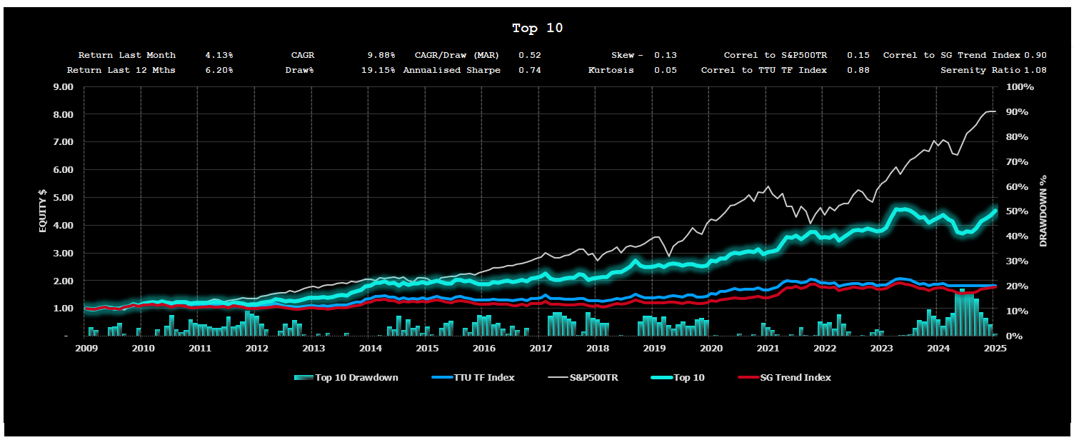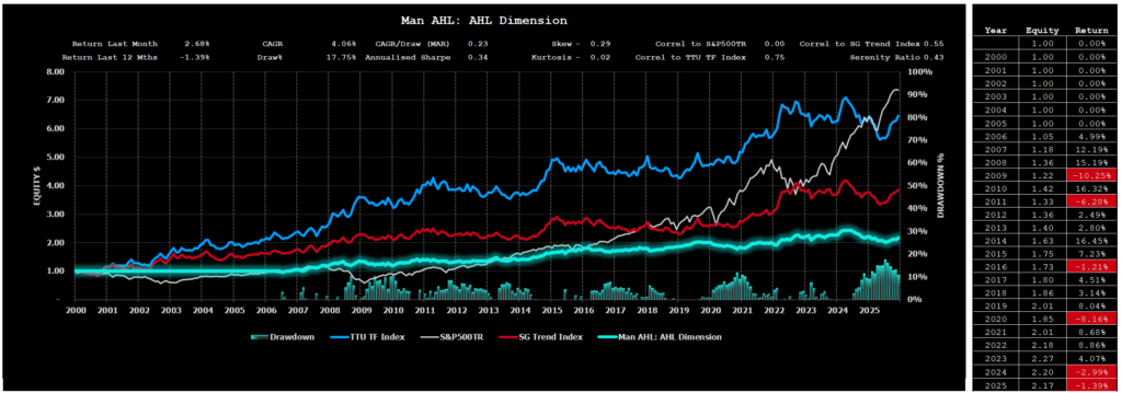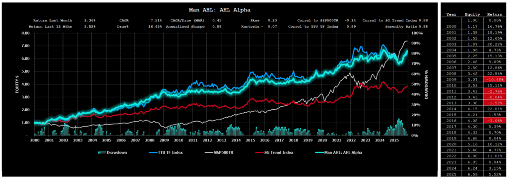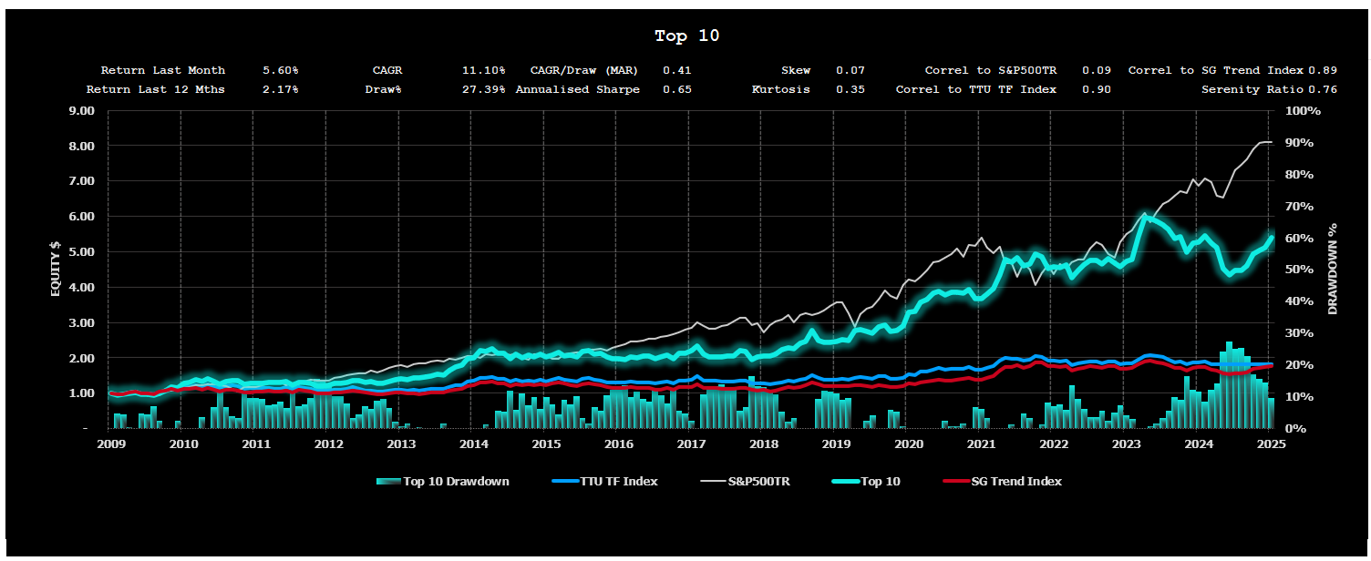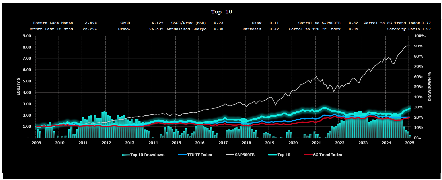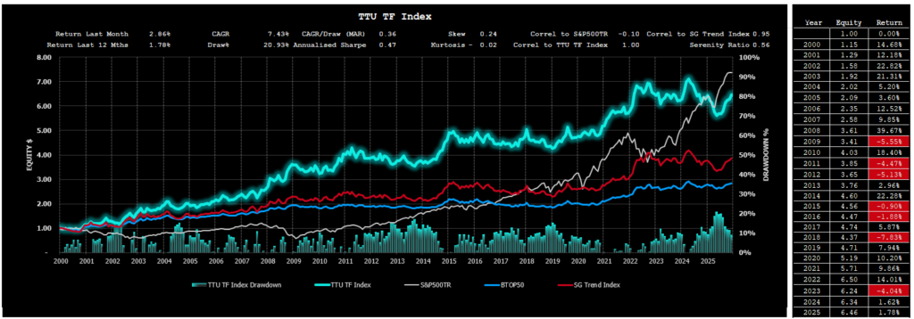 The long-term profile of the TTU TF Index remains intact and compelling. Since its inception in 2000, the index has delivered a CAGR of 7.43 percent with a maximum drawdown of 20.93 percent. These characteristics reflect the strength of its construction methodology, which prioritises the durability of verified track records over scale, popularity, or short-term risk statistics. By design, the index favours process integrity, persistence, and robustness, allowing it to endure extended drawdown phases while remaining positioned to benefit when sustained directional trends re-emerge.