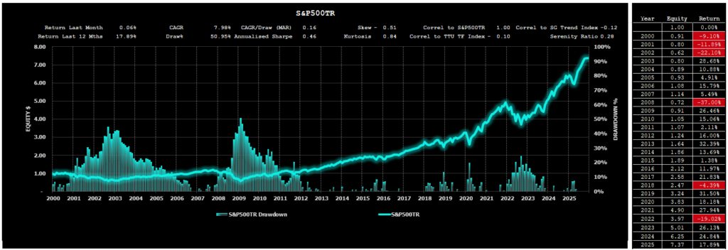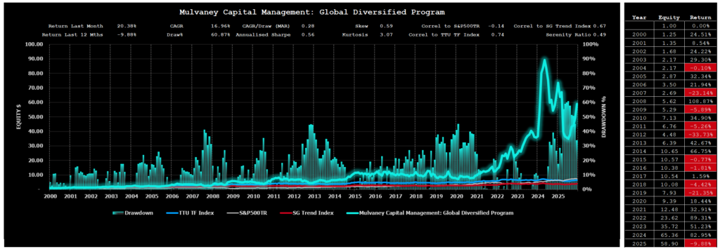 For comparison, the S&P 500 Total Return Index rose just 0.06 percent in December and now stands at 17.89 percent over the trailing twelve months. Since 2000, the S&P 500 TR has produced a CAGR of 7.98 percent, but with a substantially larger maximum drawdown of 50.95 percent. This contrast continues to reinforce the role of trend following as a structural diversifier, particularly during periods when equity markets deliver strong headline returns alongside elevated valuation risk and asymmetric downside exposure.