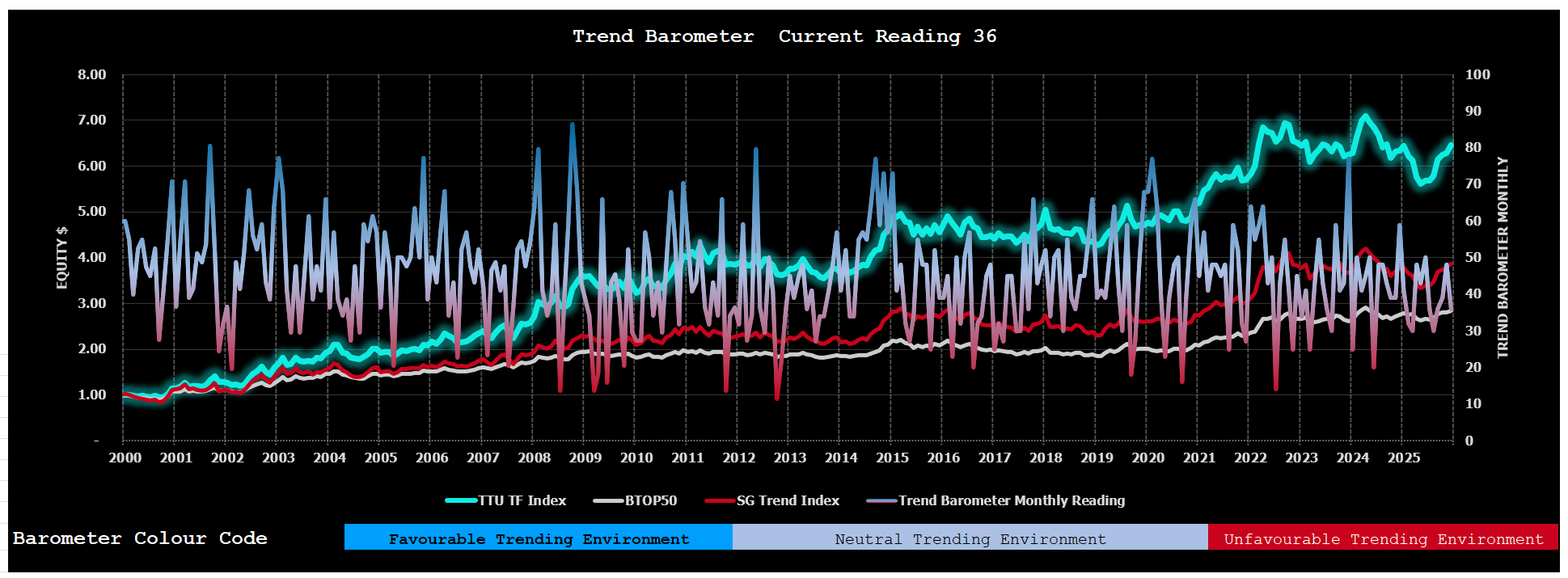 The TTU Trend Barometer closed December at 36, retreating from November's reading of 48 and signalling a narrowing of trend participation as the year drew to a close. The decline moved the Barometer back toward the lower end of the neutral zone, indicating that broad-based trend alignment remains elusive despite the strong returns posted by trend-following programs during the month.
