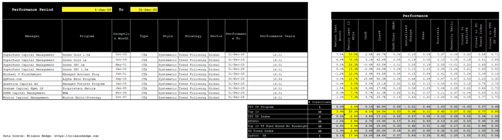 As of December 31, 2025, the TTU Trend Following Index is composed of 43 active programs, each with a long-term, fully verified performance record. The monthly index return reflects the equal-weighted average performance of all programs reporting for the period.