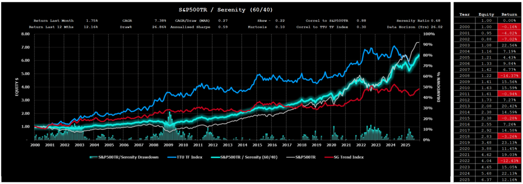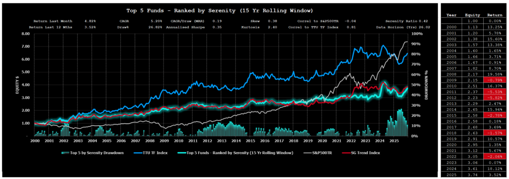 The Serenity Ratio continues to prove effective as a manager selection tool by prioritising durability, drawdown control, and long-term persistence over short-term performance metrics. Across the full reporting horizon, the Serenity composite has delivered a CAGR of 5.20 percent with a maximum drawdown of 26.82 percent, while maintaining a low correlation of −0.04 to the S&P 500 Total Return Index. These characteristics reinforce its role as a structural diversifier within multi-asset portfolios, particularly during periods when traditional asset class behaviour becomes uneven or unstable.