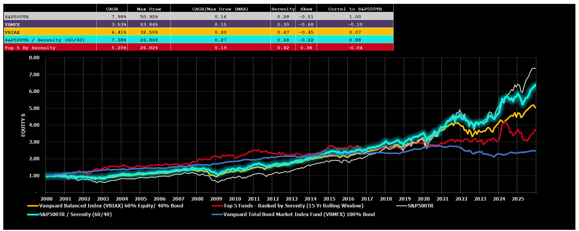- Top 5 Performers by Serenity Ratio using a rolling lookback of 15 years.