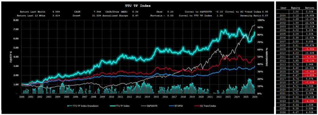 The long-term profile of the TTU TF Index remains intact and compelling. Since its inception in 2000, the index has delivered a CAGR of 7.54 percent with a maximum drawdown of 21.03 percent. These characteristics reflect the strength of its construction methodology, which prioritises the durability of verified track records over scale, popularity, or short-term risk statistics. By design, the index favours process integrity, persistence, and robustness, allowing it to endure extended drawdown phases while remaining positioned to benefit when sustained directional trends re-emerge. January's result demonstrates precisely this dynamic in action, as the surge in the TTU Trend Barometer to 68 confirmed that the broadening trend environment is now rewarding the patient positioning that characterised much of 2025.