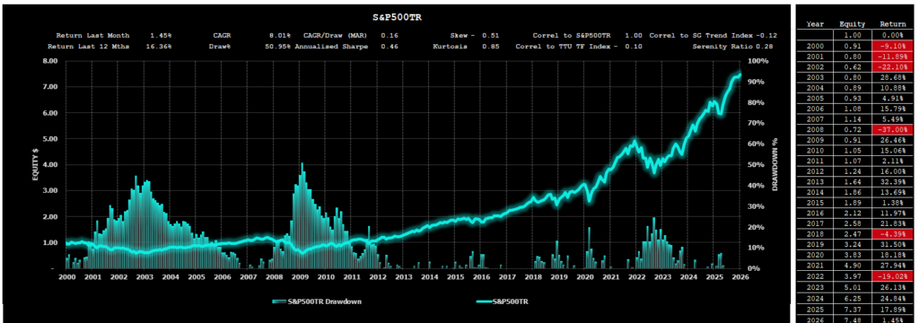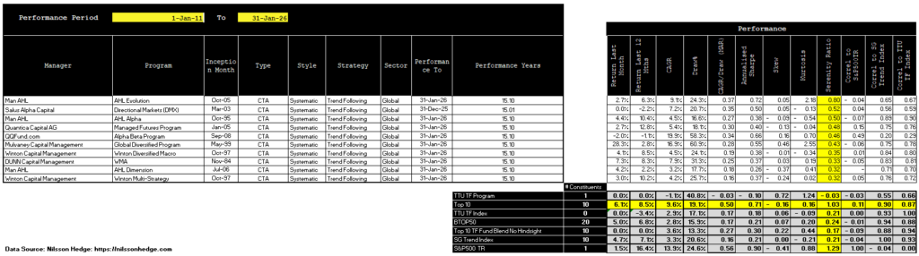 For comparison, the S&P 500 Total Return Index rose 1.45 percent in January and now stands at 16.36 percent over the trailing twelve months. Since 2000, the S&P 500 TR has produced a CAGR of 8.01 percent, but with a substantially larger maximum drawdown of 50.95 percent. This contrast continues to reinforce the role of trend following as a structural diversifier, particularly during periods when equity markets deliver strong headline returns alongside elevated valuation risk and asymmetric downside exposure. Notably, in months like January, where both asset classes advanced, the low correlation of -0.10 between the TTU TF Index and the S&P 500 TR confirms that the sources of return remain fundamentally different, preserving the diversification benefit even when both happen to perform well simultaneously.