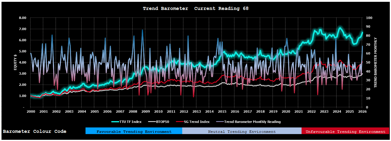 The TTU Trend Barometer closed January at 68, surging from December's reading of 36 and marking the most significant monthly shift in the Barometer in some time. The move carried the reading decisively into favourable territory, crossing the 55 threshold that historically signals an environment where trend-following programs should see good performance. After spending much of 2025 oscillating between unfavourable and neutral conditions, the Barometer's leap to 68 represents the clearest signal yet that a meaningful change in the trend landscape may be underway.