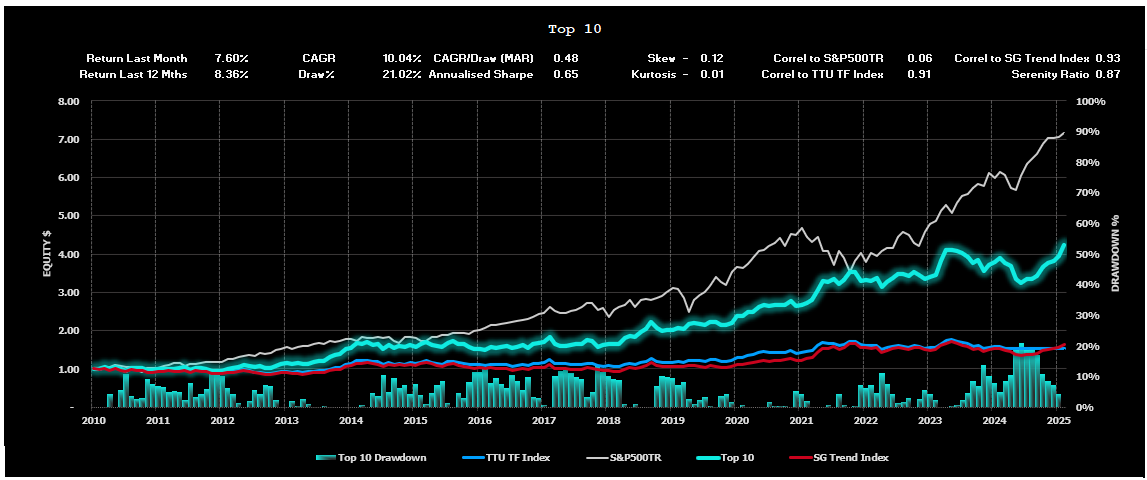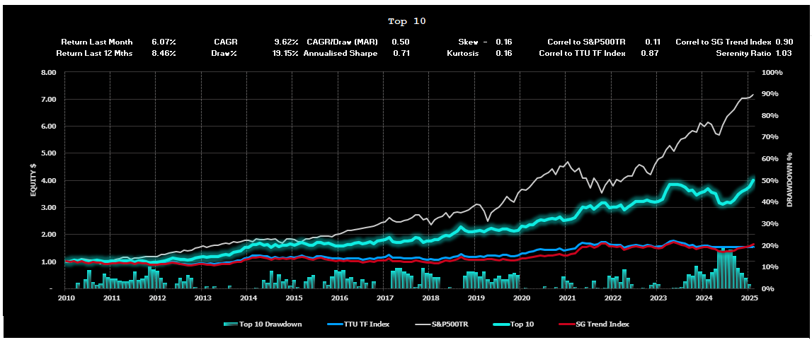 The TTU TF Index continues to exhibit strong alignment with institutional benchmarks, maintaining a correlation of 0.95 with the SG Trend Index and 0.93 with the BTOP50 Index. Yet despite these close relationships, it has consistently delivered superior long-term risk-adjusted performance. This outcome highlights the advantage of focusing on managers with proven longevity and disciplined execution rather than those whose inclusion is driven primarily by assets under management or prevailing market appeal.