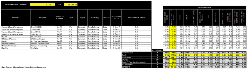As of January 31, 2026, the TTU Trend Following Index is composed of 47 active programs, each with a long-term, fully verified performance record. The expansion from 43 programs at year-end reflects four additional programs now meeting the stringent 15-year track record requirement, further broadening the composite's diversification. The monthly index return reflects the equal-weighted average performance of all programs reporting for the period.