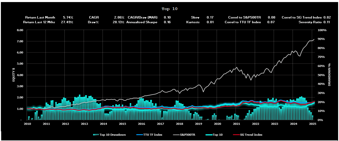Since its launch in 2000, the SG Trend Index has maintained its role as a core institutional benchmark for trend-following performance. It consistently sits between the higher-returning TTU Trend Following Index and the broader BTOP50 Index, capturing the central tendency of the industry’s largest managers. Its high correlation of 0.95 with the TTU TF Index reinforces its usefulness as a barometer of collective institutional behaviour, even as its construction produces more moderated long-run returns relative to smaller or more aggressive trend-following composites.