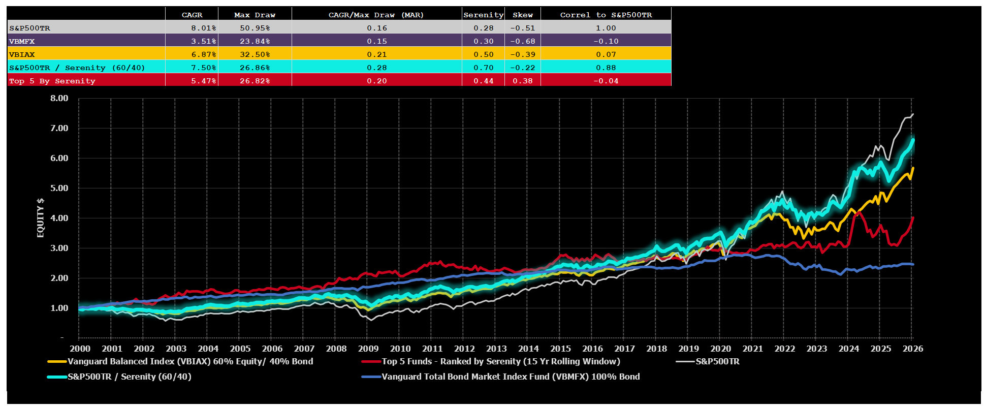 - Top 5 performers by Serenity Ratio using a rolling lookback of 15 years.