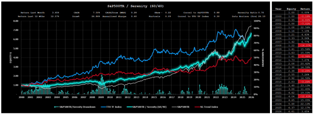 The comparison of alternative portfolio allocations above highlights the strong historic risk adjusted returns that have been enjoyed by 60% S&P500TR / 40% Serenity Composite Portfolio.