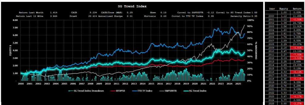 Since its inception in 2000, the SG Trend Index has held its position as a central benchmark for institutional trend-following performance. It consistently sits between the higher-returning TTU TF Index and the broader BTOP50 Index, capturing the core behaviour of the industry’s largest managers. Its correlation of 0.95 with the TTU TF Index confirms its value as a guide to the collective behaviour of established systematic trend portfolios, even though its construction often results in more tempered long-run returns.