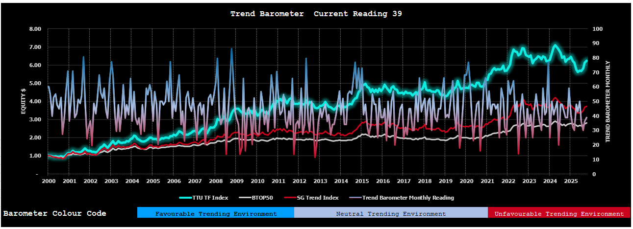 Energy continued to stabilise, large cap equities extended their advance, and selective strength appeared in commodities and rates. These pockets of opportunity helped lift the major trend indexes into positive territory for the month. The TTU Trend Barometer finished at 39, which confirms a neutral to slightly constructive environment rather than a strong one. Market conditions improved, but not to the point where trend persistence became widespread.