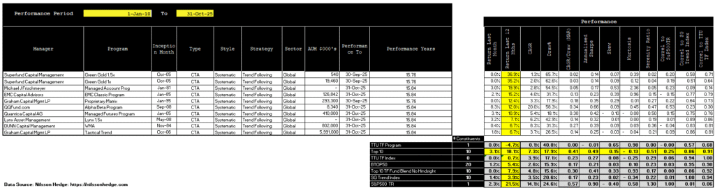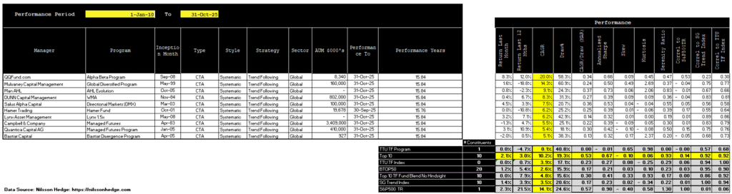 As of October 31, 2025, the TTU Trend Following Index is composed of 43 active programs, each with a long-term and fully verified performance record. The monthly return represents the average performance of all programs that submitted results for the period. For October, 39 of the 43 programs reported performance data by the cut-off date.