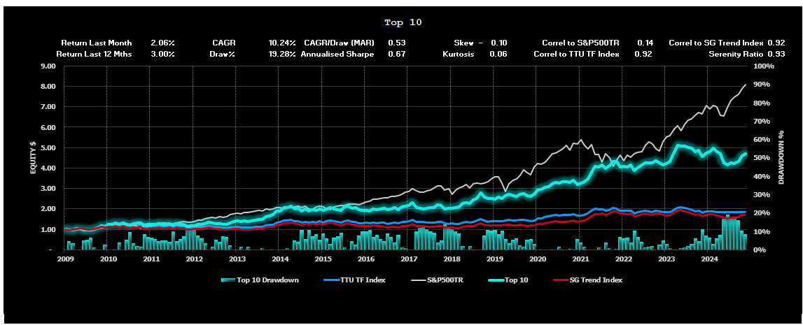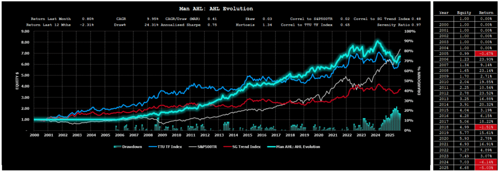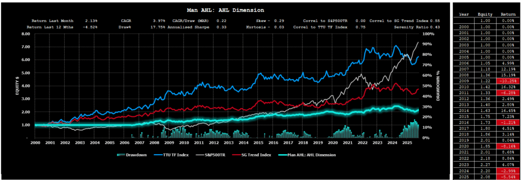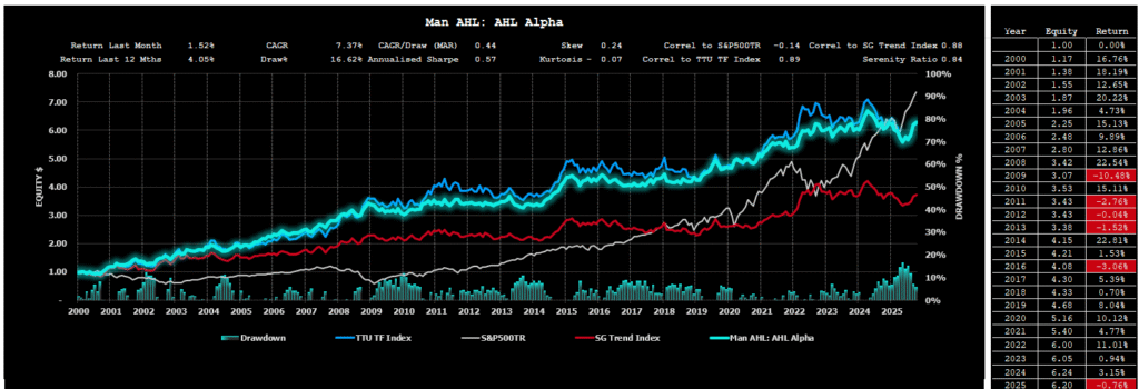 The long-term profile of the TTU TF Index remains compelling. Since 2000, the index has delivered a CAGR of 7.33 percent with a maximum drawdown of 20.93 percent. This stability is a direct result of its construction methodology, which selects managers based on the strength and longevity of their verified track records rather than AUM or short-term risk statistics. The approach continues to favour process integrity, robustness, and persistence, which allows the index to weather extended drawdown phases while capturing the benefits of strong directional markets when they appear.