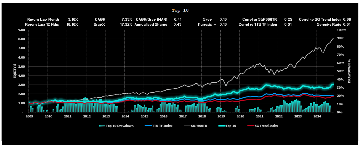 Of course, we already know this ‘diversification’ principle of Trend Following. As we increase our diversification efforts, we achieve improvements in both the maximum drawdown and the CAGR generated by the ensemble. This is why we seek to strive for maximum market and system diversification within our individual programs. The TTU TF Index takes diversification one step further by spreading across multiple TF Programs to deliver a superior risk-adjusted result.
