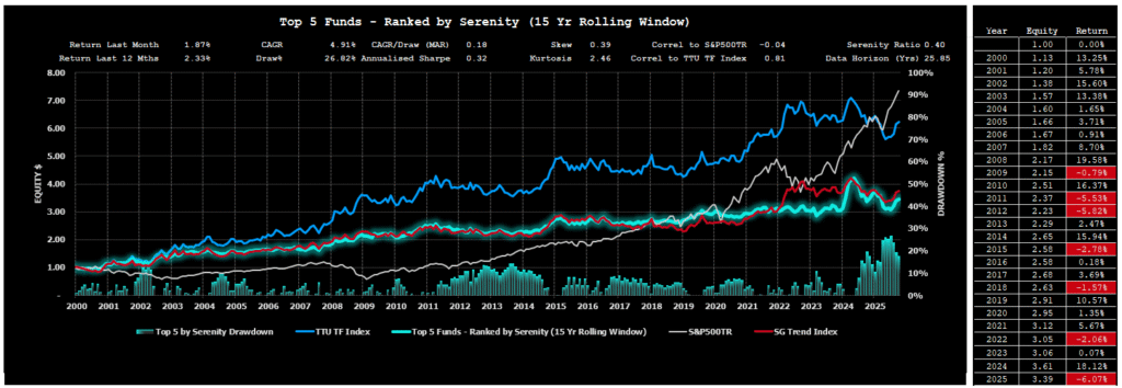 The Serenity Ratio remains a strong tool for identifying managers that combine durability with controlled drawdowns. By prioritising long-term persistence, capital protection, and process integrity, the methodology consistently favours programs that can withstand a wide range of market regimes. While short-term volatility is unavoidable, October reaffirmed the strength of this selection method in balancing robustness with recovery potential.