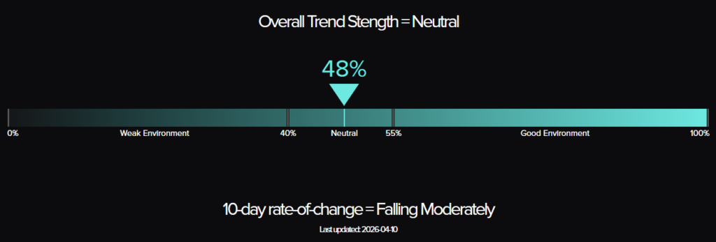 The TTU Trend Barometer fell from 55% to 48%, a drop of seven percentage points in a single week that moves the reading deeper into Neutral territory. The 10-day rate of change has deteriorated from “Falling Weakly” last week to “Falling Rapidly” this week, a meaningful escalation in the pace of barometer deterioration. This is the second consecutive week of significant decline: from 66% two weeks ago, to 55% last week, to 48% this week, a cumulative fall of eighteen percentage points across a fortnight. At 48%, the barometer remains inside the Neutral band between 40% and 55%, but the trajectory and rate of change place it on a path toward the 40% threshold that would confirm a transition into a Weak trend environment.