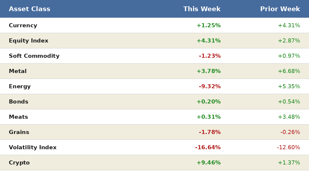 Energy positioning was the week’s dominant negative contributor by a wide margin. Long Heating Oil lost 13.75%, long Crude Oil WTI declined 13.42%, long Crude Oil Brent fell 12.68%, long Gasoline RBOB dropped 7.62%, long Natural Gas fell 5.43%, and long Ethanol declined 3.01%. The sector that was the portfolio’s strongest contributor last week became its heaviest detractor this week.