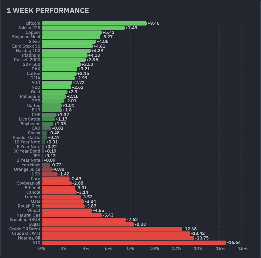 Bitcoin surged 9.46%, the best performer across all 49 assets in a powerful risk-on rotation. The Nikkei 225 gained 7.49%, leading all equity indices. Copper advanced 5.42% and Soybean Meal gained 5.27%. Silver rose 4.88%, Euro Stoxx 50 added 4.61%, Nasdaq 100 climbed 4.39%, and Platinum gained 4.13%. The Russell 2000 rose 3.95%, the S&P 500 advanced 3.52%, and the DAX gained 3.21%. All seven equity indices finished positive, with the sector averaging +4.31%, their strongest sector week in this report. The metals sector averaged +3.78%, with all five contracts positive for a second consecutive week.