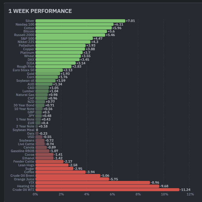 Silver led all 49 assets at +7.01%, the Nasdaq 100 advanced 6.11%, Cotton rose 5.96%, and Bitcoin gained 5.60%. The Russell 2000 climbed 5.46% to a record high. Metals averaged +4.09%, all five contracts higher for a third straight week. Equities averaged +4.15%, all seven indices higher for a second. The unifying thread was a weaker U.S. dollar, which slipped to multi-week lows as oil fell and rate-cut expectations firmed.