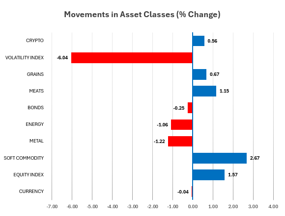 Soft commodities delivered outsized gains, equities pushed higher across major benchmarks, and cattle markets trended cleanly. Metals and energy softened, bonds eased, and currencies churned with little direction. Crypto posted small gains, while volatility continued its steep collapse.