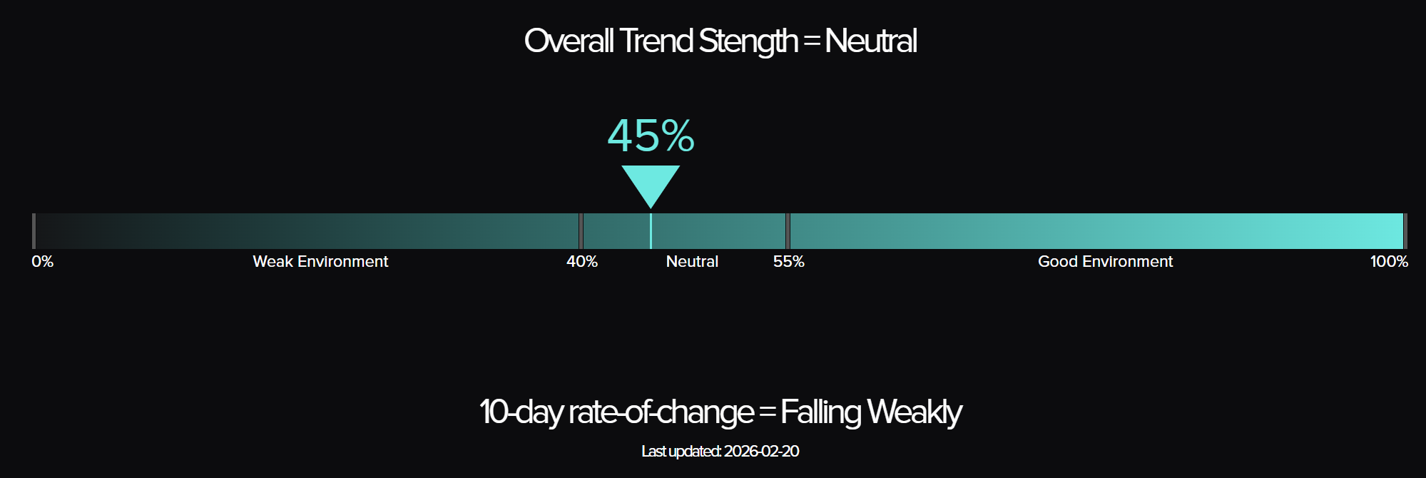 The 10-day rate of change held at "Falling Weakly," unchanged from the prior update. Trend breakdowns have decelerated but not reversed. This is neither a recovery signal nor continued deterioration. It is a pause. The January recovery from 45% to 68% remains almost entirely erased, and 45% sits squarely in the neutral zone where trend-following historically faces mixed conditions. The barometer is back at the same level it reached in mid-January before the surge began.