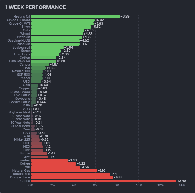Bonds reversed after four consecutive weeks of gains, with the 30-year bond declining 0.32% and the 10-year note falling 0.21%. The reversal was modest, a pause rather than a breakdown, but it marks the first negative week for the complex since mid-January. Equities recovered, with European indices leading: Euro Stoxx 50 gained 2.28% and the DAX rose 1.35%. US indices posted modest gains, though the Nikkei was the lone decliner at -0.82%. Soft commodities remained the weakest sector, dragged down by cocoa’s relentless collapse (-13.48%) and orange juice’s continued decline (-7.66%).
