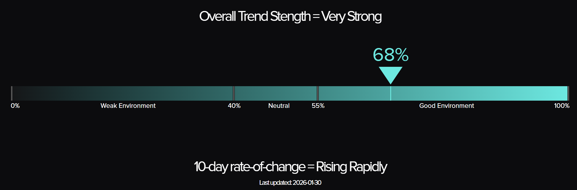 The TTU Trend Barometer surged 23 percentage points from 45% to 68%, catapulting into 'Very Strong' territory. This is a significant development. The barometer has moved from the middle of neutral to a genuinely favourable trend environment in a single week.