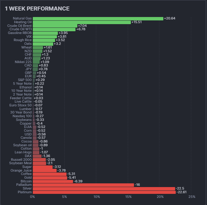 Meanwhile, energy maintained its momentum from last week's historic natural gas surge. Natural gas added another 20.64%, heating oil jumped 15.51%, and the crude complex posted solid gains. The sector remains the dominant trend theme of 2026.