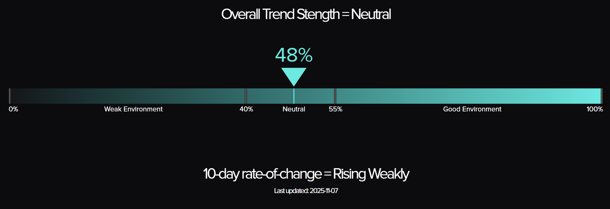 After a brief recovery phase, the index now reflects a market struggling to maintain alignment. Directional conviction remains uneven, with trend systems rotating between opportunity and caution. The transition from October’s ignition to November’s fragmentation underscores the difficulty of sustaining coordinated strength when breadth contracts.