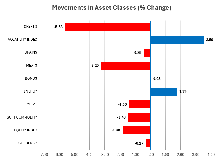 Volatility continued to rise for a second week, reinforcing the sense of instability emerging across markets. The VIX built on last week’s rebound as equities faltered and crypto sold off, signalling a transition from calm to cautious uncertainty. The tone remains measured rather than fearful, but volatility is once again asserting its influence on cross-asset behaviour. - Metals (−1.36% | prev −1.45%)