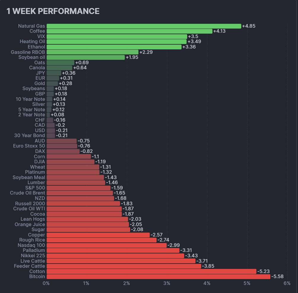 Natural gas led the market this week, rebounding sharply as colder weather forecasts and rising heating demand lifted prices. After weeks of softness, the move marked a significant technical turnaround, restoring confidence to energy trend models. - Coffee +4.13% – Supply Strain Sparks Rebound