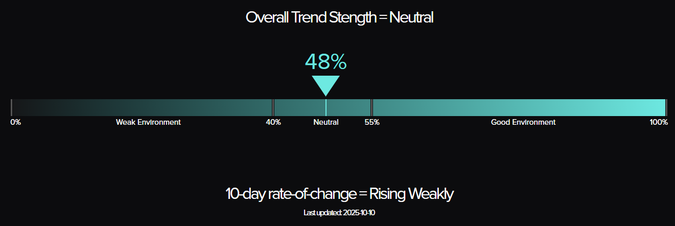 Trend conditions improved slightly into mid-week, with the barometer pushing closer to the “good environment” threshold. Friday’s event may shave some momentum into next week but the trend environment remains balanced—neither hot nor cold.