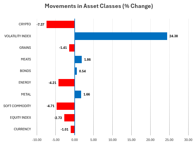 What had been a steady environment midweek flipped violently by the close. Equities gave back weeks of gains. Copper and energy collapsed. Crypto lost its speculative glow in hours. Yet metals, bonds, and select livestock trends held firm, proving once again that diversification is not decoration, it’s survival.