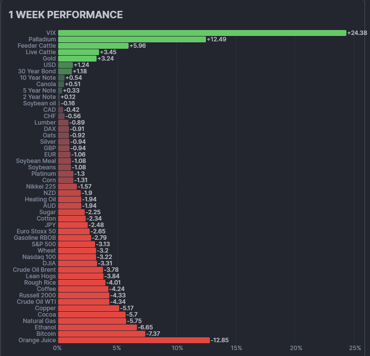 - Currencies (−1.0% | prev +0.42%) – USD firmed sharply on risk aversion, reversing the prior week’s mild softness. AUD and NZD bore the brunt of commodity-linked selling.