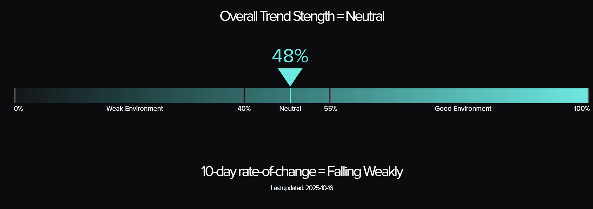 Trend strength remains neutral. The TTU Trend Barometer at 48 percent signals a market still in transition, where short-term reversals continue to dominate. Despite improved breadth in metals and rates, conviction remains thin and follow-through limited.