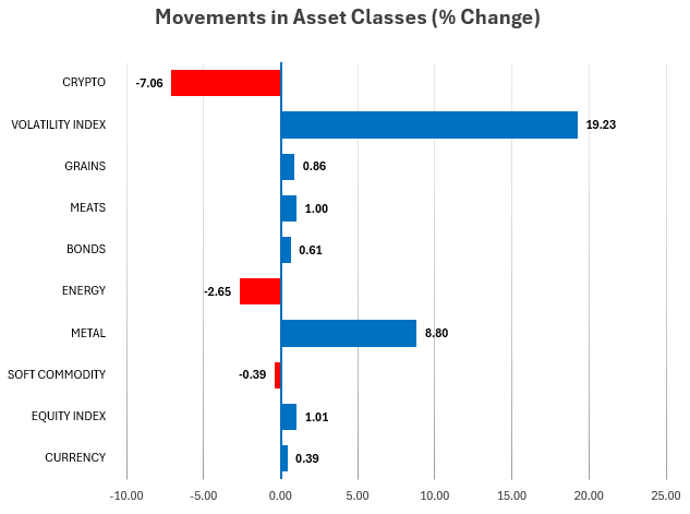 • Metals (+8.8% | prev +1.7%): Strong rotation into safe-haven assets. Gold and silver surged as macro risks persisted and yields eased.